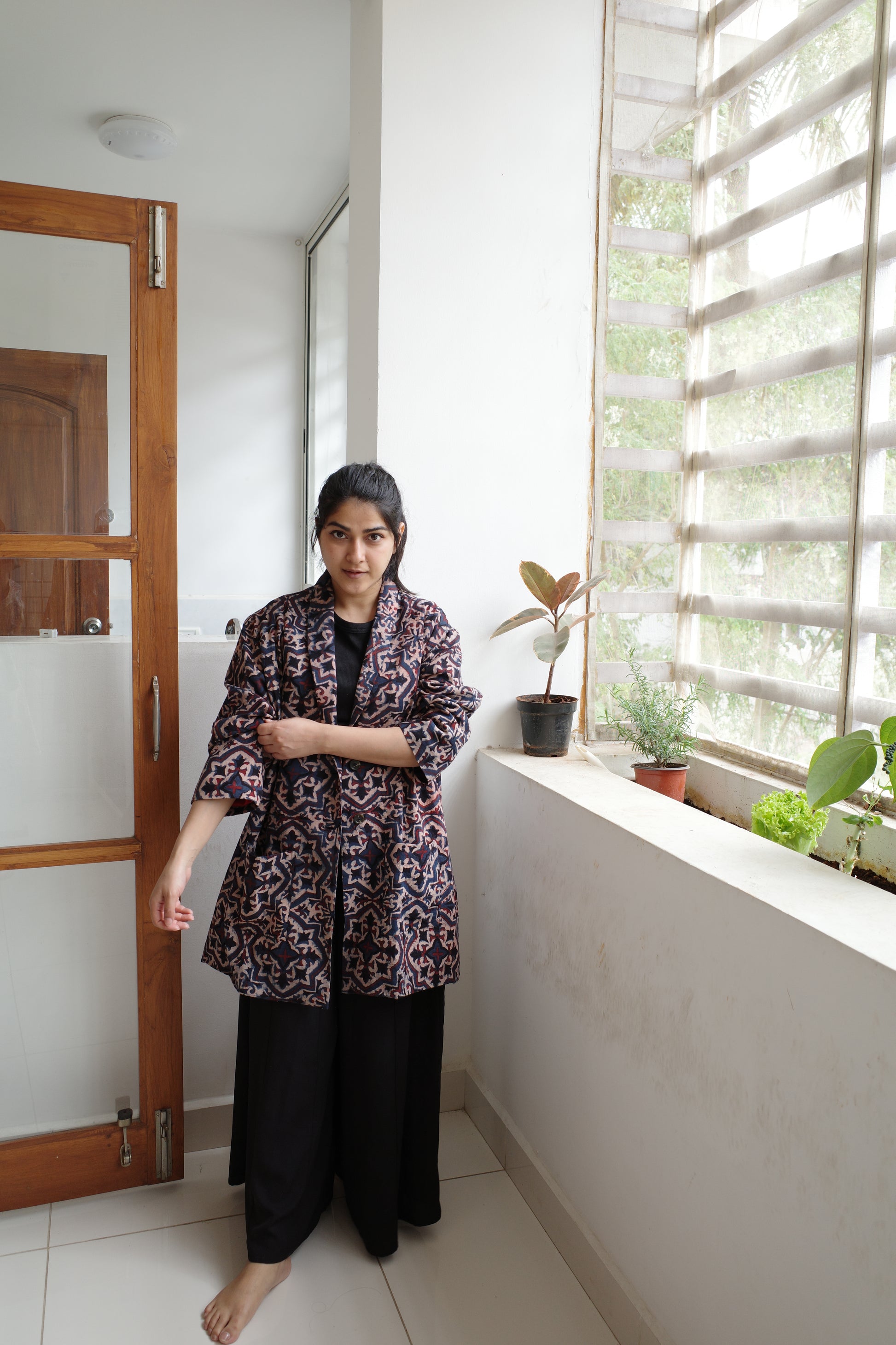 薄手のオーバーサイズジャケット。軽やかなインドコットンを使用し、冬の重ね着にも取り入れやすく、季節が進めば春の羽織りとしても活躍する一枚に仕上げました。ジャケットとカーディガンの中間のような軽さで、季節の変わり目に活躍します。