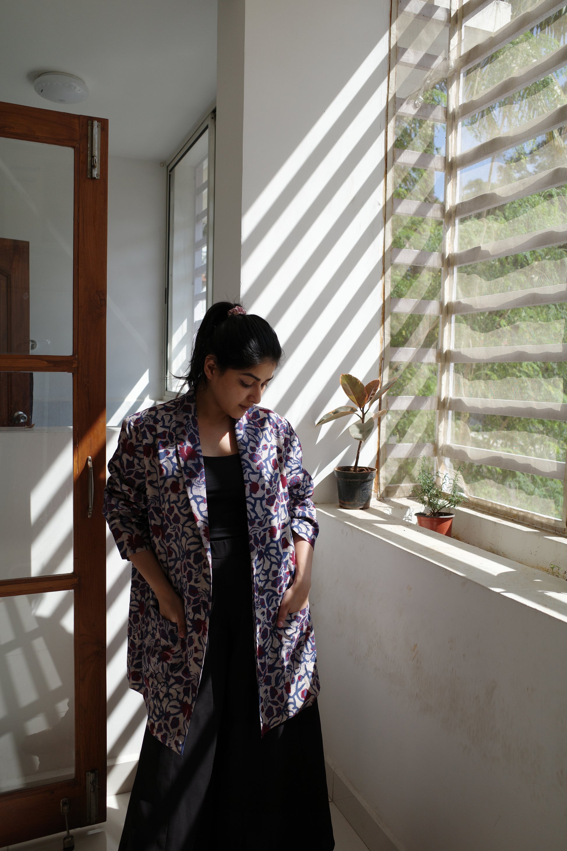 薄手のオーバーサイズジャケット。軽やかなインドコットンを使用し、冬の重ね着にも取り入れやすく、季節が進めば春の羽織りとしても活躍する一枚に仕上げました。ジャケットとカーディガンの中間のような軽さで、季節の変わり目に活躍します。